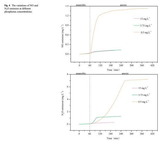 3. NO和N?O排放總量與排放因子(來自圖4和表2):計算了不同磷濃度下NO和N?O的累積產生量及其占去除氮量的比例。該數據量化了磷濃度對溫室氣體和有害氣體排放的顯著影響,表明低磷濃度(0.5 mg L?1)下的排放因子是髙磷濃度(15 mg L?1)下的數十倍。