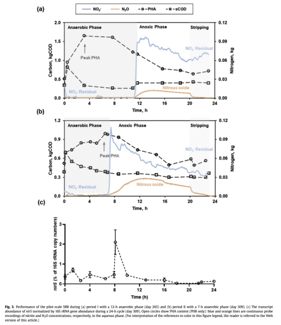 2. 厭氧相的時長對PHA的合成與利用效率至關(guān)重要。縮短厭氧相(至4-8小時)可以防止PHA的發(fā)酵損失,使其更有效地在后續(xù)缺氧相中被用于將NO2-還原為N2O。