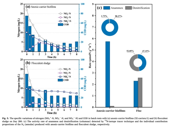 4. 1?N同位素示蹤結果(來自圖5c):通過測定產生的2?N?和3?N?的比例,定量計算了anammox和反硝化途徑的氮氣產率及其對總脫氮的貢獻比例。該數據提供了最直接的證據,證明在缺氧生物膜中,anammox是脫氮的主要途徑(貢獻率98.27%),并且其活性速率遠高于反硝化,從機理層面揭示了anammox的核心作用。