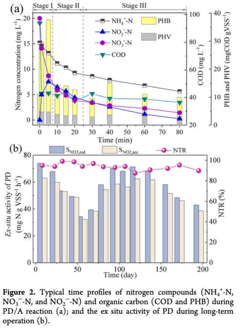 2. 微生物活性數(shù)據(jù)(來(lái)自圖2b):通過(guò)批次實(shí)驗(yàn)測(cè)定了PD過(guò)程的比硝酸鹽還原速率(SNO3,red)、比亞硝酸鹽積累速率(SNO2,acc)和硝酸鹽轉(zhuǎn)化率(NTR),以及anammox的活性。該數(shù)據(jù)揭示了功能微生物的核心代謝能力,表明PD過(guò)程具有高且穩(wěn)定的NO??-N積累能力(NTR >90%),且對(duì)溫度變化不敏感,這是PD/A工藝穩(wěn)定運(yùn)行的關(guān)鍵機(jī)理。