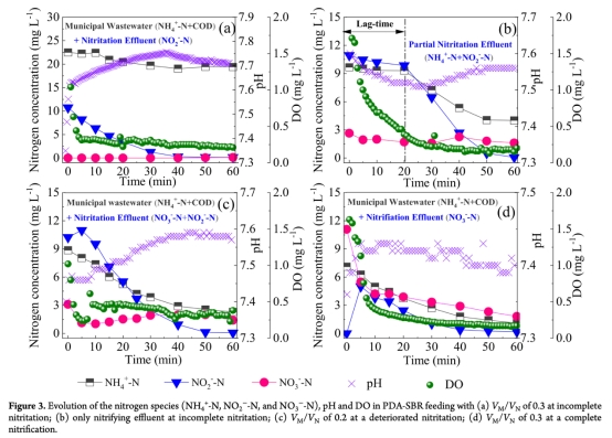 3. 典型周期轉(zhuǎn)化曲線(xiàn)(來(lái)自圖2a, 圖3):展示了PD/A-SBR一個(gè)反應(yīng)周期內(nèi)氮化物(NH??-N, NO??-N, NO??-N)和有機(jī)物(COD, PHA)濃度的動(dòng)態(tài)變化。該數(shù)據(jù)直觀揭示了“PD快速產(chǎn)生NO??-N”與“anammox同步消耗NH??-N和NO??-N”的耦合過(guò)程,以及內(nèi)碳源(PHA)在后續(xù)反硝化中的作用,為理解工藝內(nèi)在反應(yīng)機(jī)制提供了時(shí)間序列證據(jù)。