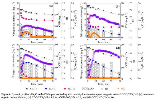 3. 揭示N?O產(chǎn)生與操作條件的關(guān)聯(lián):通過(guò)關(guān)聯(lián)不同外碳源(乙酸)投加量(COD/NO??-N比)與N?O的動(dòng)態(tài)曲線(xiàn),發(fā)現(xiàn)當(dāng)外碳源充足(COD/NO??-N ≥ 2)時(shí),N?O幾乎不積累;而當(dāng)碳源受限時(shí),會(huì)出現(xiàn)短暫且低濃度的N?O峰值。這揭示了碳源充足是抑制PD/A工藝N?O產(chǎn)生的關(guān)鍵操作條件,為優(yōu)化工藝運(yùn)行、最小化溫室氣體排放提供了明確指導(dǎo)。