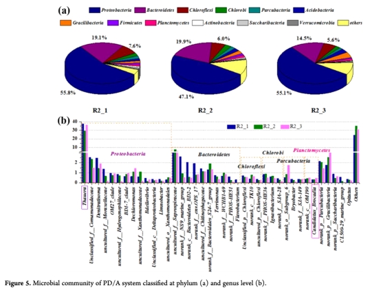 5. 微生物群落結(jié)構(gòu)數(shù)據(jù)(來(lái)自圖5):通過(guò)高通量測(cè)序獲得了不同運(yùn)行時(shí)間點(diǎn)污泥微生物群落在門(mén)水平和屬水平的組成。該數(shù)據(jù)表明Thauera(PD功能菌)和Ca. Brocadia(anammox菌)在整個(gè)運(yùn)行過(guò)程中持續(xù)存在并成為關(guān)鍵功能菌屬,從微生物生態(tài)學(xué)角度解釋了工藝功能穩(wěn)定性的原因。