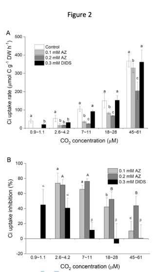2. Ci吸收動力學參數(shù)(來自圖1C, D, E;圖2):計算了Ci吸收速率對CO?濃度的初始斜率(反映親和力,圖1C)、CO?補償點(圖1D)、以及Ci/堿度比值(反映對Ci庫的利用效率,圖1E)。圖2展示了不同CO?濃度下的Ci吸收速率及抑制率。這些數(shù)據(jù)揭示了AZ和DIDS如何特異性影響Ci吸收的不同環(huán)節(jié)(如AZ顯著降低吸收親和力并提高補償點),為區(qū)分三種吸收途徑提供了關(guān)鍵動力學依據(jù)。