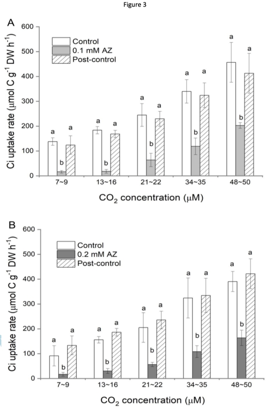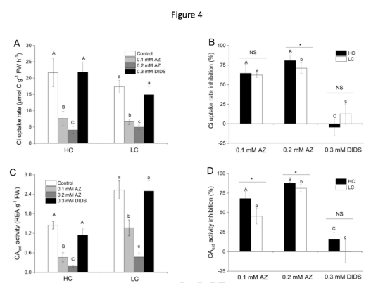 3. CAext酶活性數(shù)據(jù)(來自圖4C, D):直接測量了葉片CAext的活性(圖4C)以及AZ和DIDS對活性的抑制效果(圖4D)。該數(shù)據(jù)從生化水平證實了CAext的存在及其對AZ的敏感性,而DIDS不抑制CAext活性,表明兩者作用靶點不同。