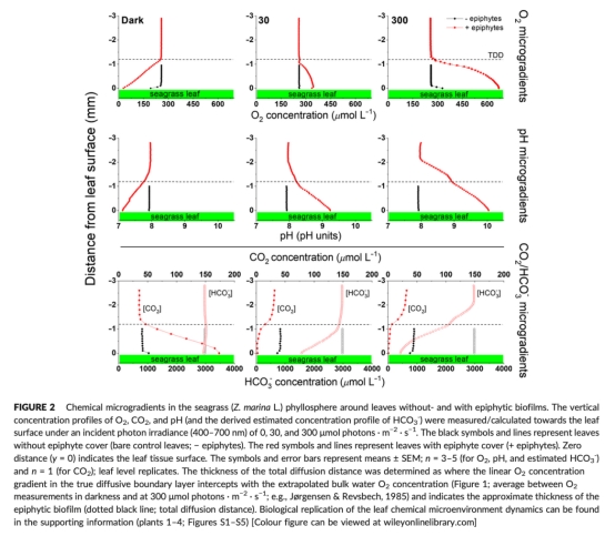 3. 二氧化碳(CO2)濃度微梯度(圖2, 表1):首次直接測量了海草葉片表面的CO2濃度動態。研究意義:顯示附生生物膜在光照下導致葉片表面CO2幾乎完全耗盡(~0 μM),低于海草的CO2補償點,造成嚴重的碳限制;在黑暗中則因呼吸作用導致CO2積累。