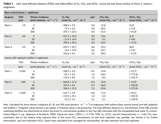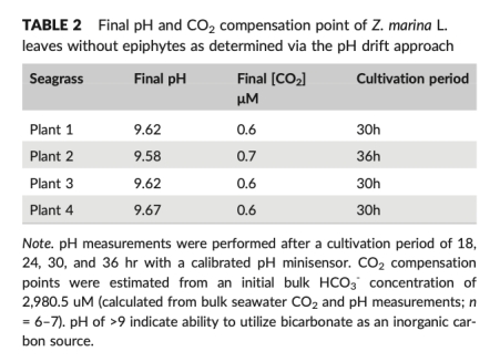 6. 最終pH和CO2補償點(表2):通過pH漂移實驗測定。研究意義:確定了該種海草利用HCO3-的能力(最終pH > 9)和維持光合作用所需的最低CO2濃度(~0.6 μM),為解釋微傳感器數據提供了關鍵的生理閾值。