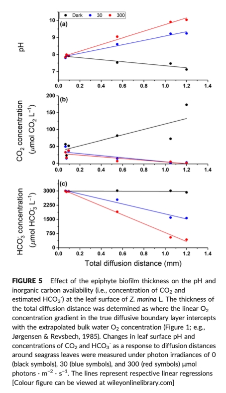 4. 葉片表面的極端高pH和低CO2水平超過了海草的最終pH和CO2補償點,直接抑制了其光合作用效率。