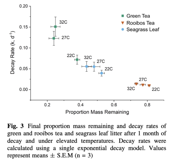 3. 標(biāo)準(zhǔn)化茶葉凋落物(綠茶和路易波士茶)能夠有效捕捉一系列分解特性,代表了從易分解到難分解的連續(xù)譜,可作為研究藍(lán)碳分解過程有用的代理物,并與自然凋落物使用相同的指數(shù)衰減模型進(jìn)行比較。