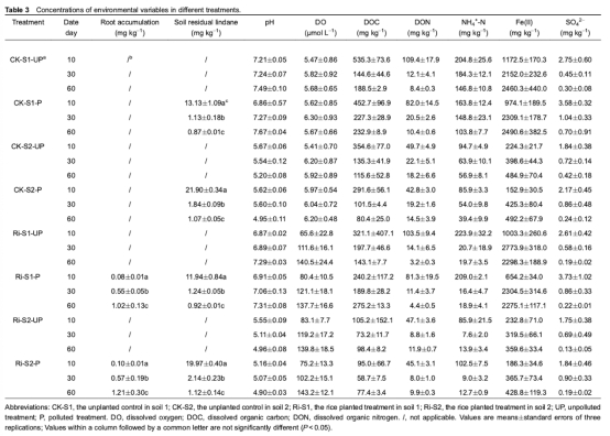 2. 水稻生長通過根系氧損失(ROL)改變根際氧化還原環境,與微生物介導的競爭性電子消耗過程(SO?2?還原、Fe(III)還原)耦合,抑制林丹的還原性脫氯降解(60天時降解率降低0.5-1.2%)