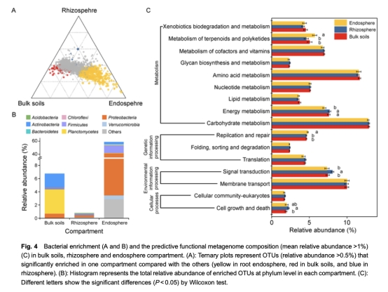 4. 不同根區形成功能分化微生物群落:根際富集能量代謝和信號轉導功能,根內富集萜類代謝和DNA修復功能,增強系統韌性