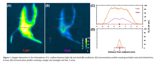 ? 結(jié)果:L. uniflora根際光照下氧濃度達(dá)90%(根束區(qū))和44%(單根區(qū)),黑暗時降至12-30%;S. europaea根際光照下氧濃度達(dá)68%。