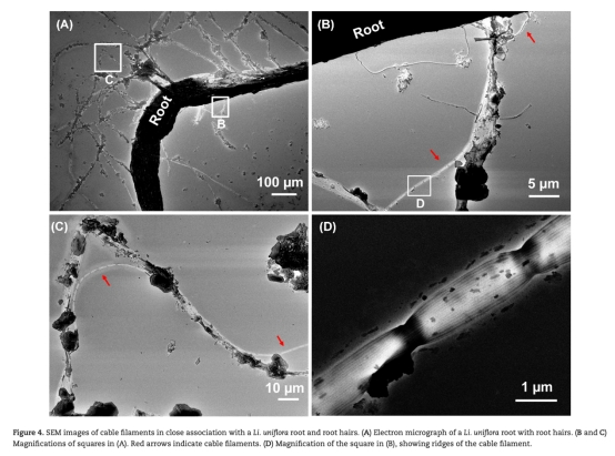 ? SEM顯示電纜細(xì)菌與根毛緊密纏繞,具典型脊?fàn)罱Y(jié)構(gòu)(圖4B-D)。
