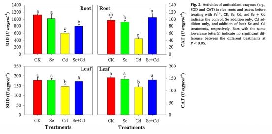 2. 抗氧化酶活性(SOD和CAT):來自圖2。研究意義:Cd降低了SOD和CAT活性(根部分別減少46.7%和54.2%),而Se恢復了這些酶的活性(根部分別增加33.2%和135%)。該數據揭示了Se通過增強抗氧化防御系統緩解Cd誘導的氧化應激。