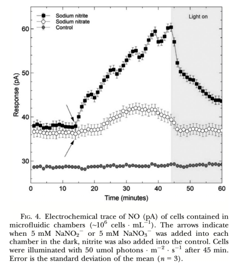 3. 光調控研究: 在微流體室中精確控制光照條件(黑暗、低光、高光),并結合光合抑制劑DCMU處理,研究光照及光合電子傳遞對NO產生的影響。