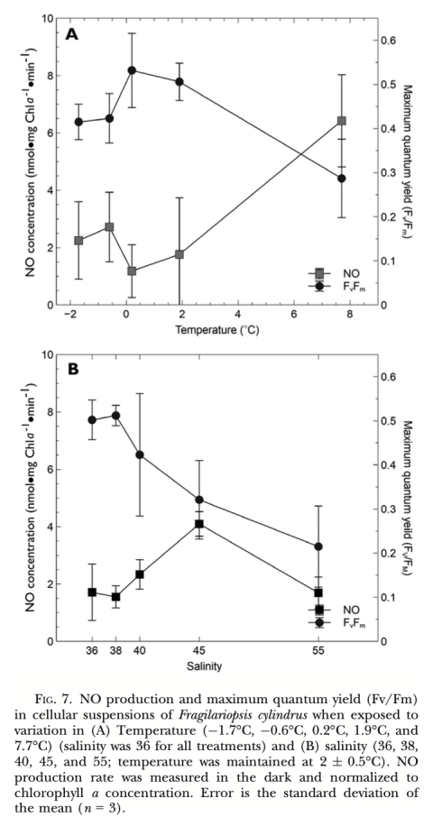 2. 環境響應: 溫度升高(>0°C,尤其是7.7°C)和高鹽脅迫(>38)均可誘導NO產生,同時伴隨光合效率(Fv/Fm)下降,表明NO產生與環境脅迫密切相關。藻源醛類(DD)也能強烈誘導NO產生。