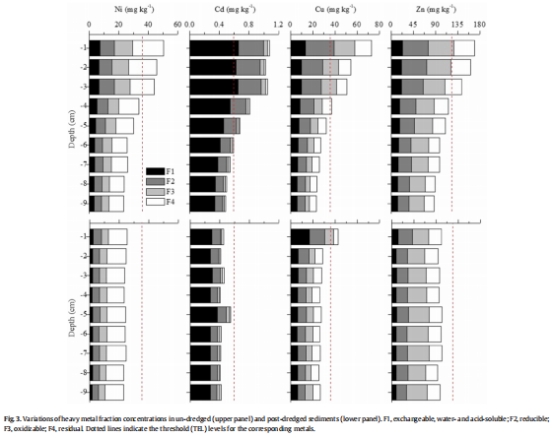 意義:直接證明疏浚有效地移除了沉積物中的重金屬,降低了總污染負(fù)荷。形態(tài)分析顯示,疏浚后重金屬在活性較強(qiáng)的非殘?jiān)鼞B(tài)中的比例依然很高,暗示其具有潛在的遷移風(fēng)險(xiǎn)。