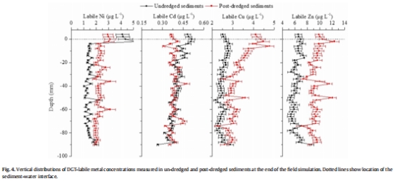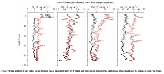 意義:這是本研究最核心的發(fā)現(xiàn)。結(jié)果表明,盡管總濃度下降,但疏浚區(qū)孔隙水中DGT有效態(tài)Ni、Cu和Zn的濃度和計(jì)算出的釋放通量卻顯著高于未疏浚區(qū)。這揭示了疏浚可能短期內(nèi)增加重金屬的生物有效性和生態(tài)風(fēng)險(xiǎn)。