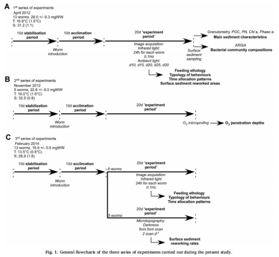 第一系列實驗(Fig. 1A):核心實驗。通過視頻記錄分析(0.1 Hz頻率,持續24小時) 研究攝食行為學、行為類型和時間分配。在實驗結束后,對區分出的三個區域(未擾動區、覓食區、糞便堆區)的表層沉積物進行采樣,分析其理化特性(粒度、有機碳/氮、葉綠素a/脫鎂葉綠素a) 和好氧細菌群落組成(通過ARISA指紋圖譜技術)。