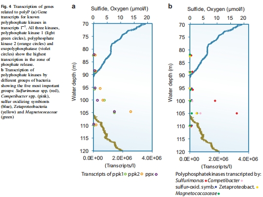 本研究探討了黑海亞氧化帶(suboxic zone)中大型磁敏細菌(magnetotactic bacteria) 通過積累和降解多聚磷酸鹽(polyphosphate, polyP) 對磷酸鹽(phosphate)剖面分布的調控作用。黑海亞氧化帶(90-106 m水深)的特點是既無氧氣也無硫化物,但其溶解磷酸鹽濃度在上邊界出現最小值、下邊界出現最大值,并伴隨顆粒磷(particulate P)的峰值。傳統理論認為該現象由鐵錳氧化物吸附-解吸驅動,但僅能解釋部分磷通量。本研究通過綜合現場觀測、顯微分析、分子生物學和數值模擬,發現一類大型磁敏細菌(屬 Magnetococcus)富含多聚磷酸鹽(含磷量26–34%),其豐度與顆粒磷峰值一致;且在磷酸鹽最大釋放區檢測到多種細菌(包括 Magnetococcaceae)的多聚磷酸鹽激酶(polyphosphate kinase)基因高表達,表明細菌主動降解polyP釋放磷酸鹽。研究者提出,這些細菌通過磁導向運動在亞氧化帶上下“穿梭”,在上邊界 scavenge 磷酸鹽并儲存為polyP,在下邊界降解polyP釋放磷酸鹽,該主動運輸機制可定量解釋觀測到的磷酸鹽分布。