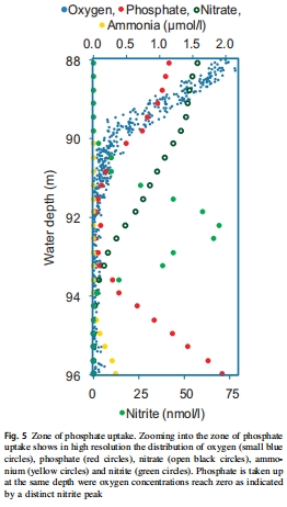 意義:磷酸鹽吸收發生在上邊界氧耗盡處(DO→0),與亞硝酸鹽峰值重合,提示硝酸鹽還原可能是細菌攝取磷的能量來源;磷酸鹽釋放與硫化物出現深度關聯,暗示硫化物觸發polyP降解。