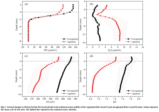 建立環(huán)境梯度與生態(tài)功能的因果聯(lián)系:高分辨率剖面揭示了化學(xué)參數(shù)的陡峭梯度。例如,DO在植被區(qū)僅穿透至水下2.5 mm深處(圖1a),表明有機(jī)質(zhì)快速耗氧,導(dǎo)致緊鄰界面下方即轉(zhuǎn)為厭氧狀態(tài)。這種精確的空間關(guān)聯(lián)將表層碎屑的輸入(高TOC)與底層厭氧代謝(致臭物產(chǎn)生)直接耦合,避免了傳統(tǒng)分層采樣可能模糊的因果關(guān)系。