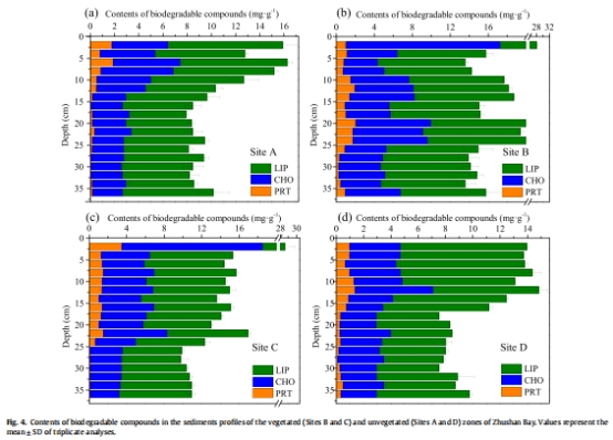 意義:植被區(qū)可降解化合物含量顯著更高(脂質(zhì)主導(dǎo)),這些物質(zhì)是微生物分解的底物,與致臭物生成直接相關(guān)。其垂直波動(dòng)反映碎屑沉積的不連續(xù)性。