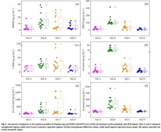 意義:植被區(qū)致臭物濃度極高(如β-cyclocitral達(dá)2561 ng·g?1),且隨深度劇烈波動(dòng),表明碎屑?jí)|是“熱點(diǎn)”源。無植被區(qū)濃度低且隨深度遞減,擴(kuò)散風(fēng)險(xiǎn)小。