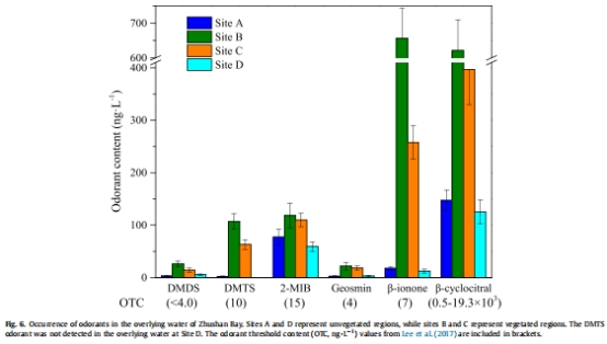 擴(kuò)散風(fēng)險(xiǎn):沉積物與上覆水中致臭物濃度呈對(duì)稱分布,表明碎屑?jí)|分解產(chǎn)物可擴(kuò)散至水體,威脅水質(zhì)安全。