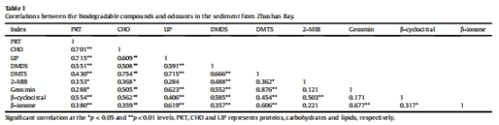 致臭物產(chǎn)生熱點(diǎn):植被區(qū)沉積物是致臭物的主要來源地,濃度是無植被區(qū)的3-52倍,其中β-環(huán)檸檬醛、β-紫羅蘭酮和DMTS是優(yōu)勢(shì)組分。其生成與可降解化合物含量顯著相關(guān)(p<0.01),多元回歸表明這些化合物可有效預(yù)測(cè)致臭潛力(表2)。