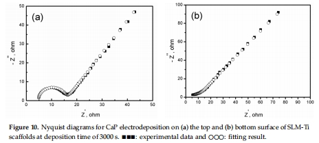 研究意義:EIS結果動態地反映了沉積過程中電極/溶液界面性質的變化。圖10 的對比表明,頂部表面的阻抗譜存在明顯的容抗弧(受電荷轉移控制),而底部表面的阻抗譜則以擴散特征為主。這強有力地證明了支架不同深度的電沉積反應是不同步、不均勻的,頂部反應快,底部反應慢且受傳質限制嚴重。