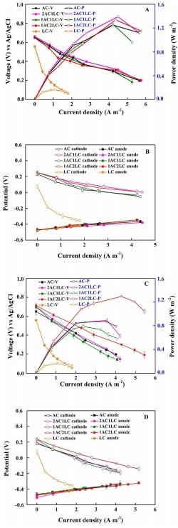 研究意義:圖3 和圖5 是核心性能數(shù)據(jù)。圖3A 顯示在非生物條件下,添加LC(除純LC外)能提高陰極電流密度。圖5A、C 則更關(guān)鍵地表明,在長(zhǎng)期運(yùn)行后,1AC2LC陰極的功率密度幾乎無衰減,而其他陰極(包括純AC)均出現(xiàn)顯著下降。這證明了LC在實(shí)際生物環(huán)境中對(duì)于維持陰極性能穩(wěn)定的卓越效果。