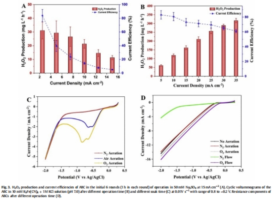 對ABC陰極施加輕度加壓空氣是一種有效的強化手段,主要通過增強H?O?的傳質來抑制副反應,從而將高產率和高電流效率提升到新高度(如35 mA cm?2下產率461 mg L?1 h?1,CE 89%)。