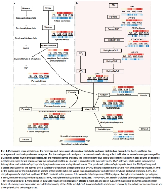 數據來源:圖3 展示了參與木質素降解(a, c)和碳水化合物活性酶(b, d)的基因覆蓋度(宏基因組)和蛋白表達量(宏蛋白質組)在腸道各區域的分布。圖4 通過示意圖整合了宏組學數據,展示了主要代謝途徑(如EMP途徑、磷酸酮醇酶途徑、Wood-Ljungdahl途徑)的空間分布。
