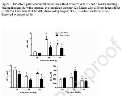 數(shù)據(jù):Figure 1通過曲線圖展示了dH2、dCH4和dH2S在晨飼后0、2.5和6小時(shí)的變化趨勢,CG組dH2S在2.5小時(shí)峰值顯著高于CM組。