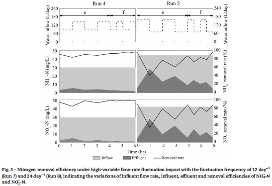 數據:在穩(wěn)定期(Run 2),NH4+和NO2-去除效率分別達93.5%和96.9%,TN去除率82.3%。在沖擊負荷期(Runs 4-6),系統能快速適應流量波動,恢復高去除率(>90%),適應時間隨頻率增加而延長(最高60天)。