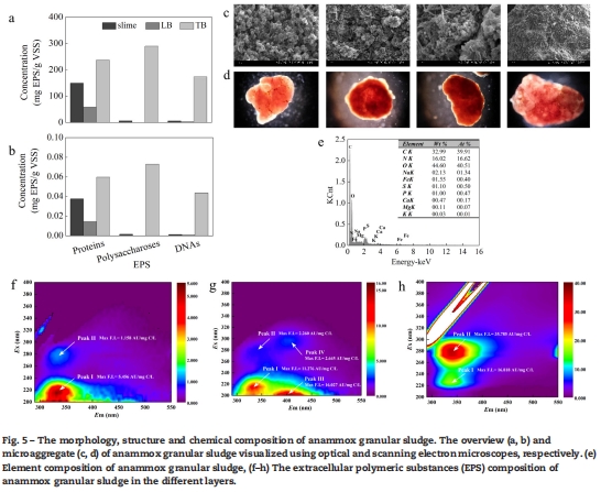數據:TB-EPS是主要EPS層(153.3 mg EPS/g VSS, 73.3%總EPS),其中多糖占47.6%,蛋白質占39.0%。SEM顯示顆粒呈“花椰菜”狀,有間隙結構。沉降速度達57.5 m/hr。