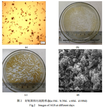 數(shù)據(jù):培養(yǎng)過程中MLSS從4630 mg/L(初始)波動至4356 mg/L(第60天),SVI從68改善至36,顆粒平均粒徑從1.3 mm增至3.2 mm。掃描電鏡(圖2d)顯示AGS結(jié)構(gòu)緊密,以短桿菌和球菌為主。