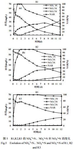 揭示了粒徑調(diào)控脫氮性能的核心機(jī)制:測量數(shù)據(jù)將粒徑與氧傳質(zhì)深度直接關(guān)聯(lián):粒徑越大,氧傳質(zhì)阻力越大,中心越易缺氧。這與脫氮性能數(shù)據(jù)(圖5)完美吻合——R2/R3的缺氧區(qū)抑制NOB(氧飽和系數(shù)1.1 mg/L),使AOB(氧飽和系數(shù)0.3 mg/L)占優(yōu),導(dǎo)致高NAR;而R1內(nèi)部DO較高,無法有效抑制NOB。這從物理傳質(zhì)角度解釋了為何粒徑增大促進(jìn)短程硝化。