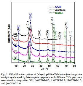 數據:XRD圖譜顯示,隨著TiO2前體濃度增加,CCN的(002)峰強度減弱,TiO2的anatase相(2θ=25.4°)和rutile相特征峰出現。