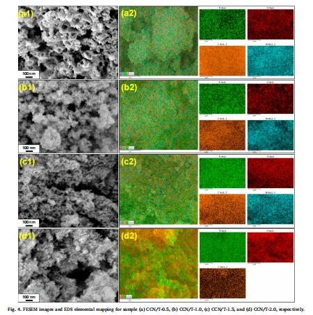 數據:FESEM和TEM圖像顯示,低TiO2濃度時CCN主導形貌,高濃度時出現TiO2納米棒核殼結構(CCN/T-1.5殼厚約1.0 nm)。