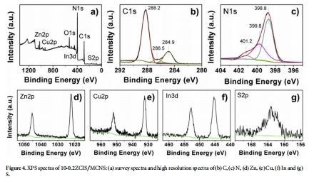 數(shù)據(jù):高分辨率光譜顯示C 1s(288.2 eV)、N 1s(398.8 eV)、Zn 2p(1022.0 eV)、Cu 2p(932.3 eV)、In 3d(445.3 eV)、S 2p(163.3 eV)的特征峰。