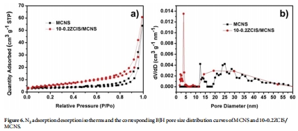 數(shù)據(jù):MCNS和10-0.2ZCIS/MCNS的比表面積分別為12.32和15.93 m2 g?1,平均孔徑約20 nm,呈介孔結(jié)構(gòu)。