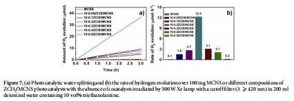 10-0.2ZCIS/MCNS在無貴金屬助催化劑下產(chǎn)氫速率最高(12.3 μmol h?1),是純MCNS的110倍,且具有良好的穩(wěn)定性。