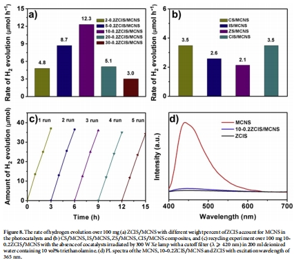數(shù)據(jù):10-0.2ZCIS/MCNS產(chǎn)氫速率最高(12.3 μmol h?1),是純MCNS的110倍;最優(yōu)組成為10 wt% ZCIS和Cu/In摩爾含量0.2。