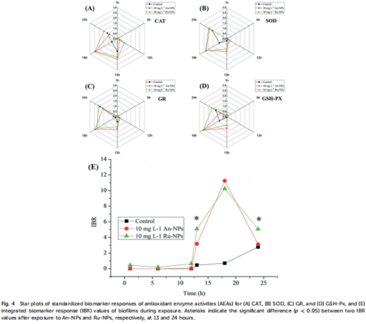 研究意義:IBR綜合了多種酶活性,有效評估生物膜健康狀態(tài)。An-NPs的急性效應(yīng)與光氧化相關(guān),Ru-NPs的漸進毒性與滲透和細胞內(nèi)ROS相關(guān)。