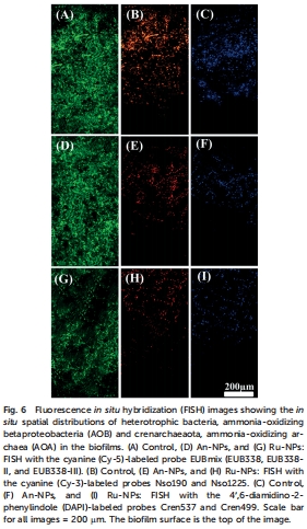 數(shù)據(jù):FISH圖像顯示An-NPs減少表面AOMs(AOB和AOA)豐度,Ru-NPs導(dǎo)致更均勻的減少;AOB在An-NPs組主導(dǎo)氨氧化,AOA在Ru-NPs組貢獻增加。
