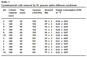 數據:在最佳EC條件(pH 8, 100 mA, 通氣)下,藍藻細胞去除率達91±2%;延長反應時間至60分鐘,去除率提高至96±1%。