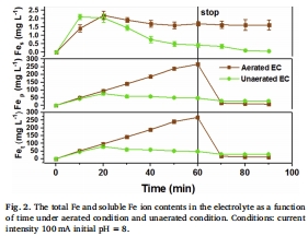 數據:通氣EC中總鐵(Fe_t)濃度線性增加至268±8 mg L?1(60分鐘),無通氣EC僅79±11 mg L?1;沉降階段Fe_t快速下降。