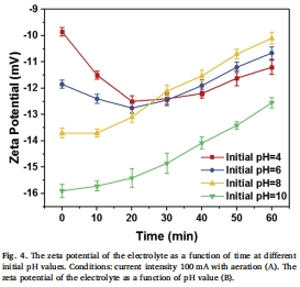 數據:初始pH 8時,zeta電位從-16 mV變為-10.1 mV(60分鐘),表明電荷中和和掃掠絮凝協同作用。